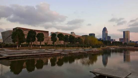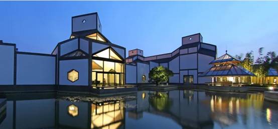新馆色调以传统的粉墙黛瓦为元素,给江南建筑符号增加了新的诠释内涵。在建筑构造上,屋面形态的设计突破了中国传统建筑“大屋顶”在采光方面的束缚,玻璃、开放式钢结构可以让室内借到大片天光,同时透过简单的几何线条营造了光影变化。新馆园艺造景设计从古典园林的精髓中提炼而出,由池塘、假山、小桥、亭台、竹林等组成的创意山水园与传统园林有机结合,创造性地将博物馆、古建筑与园林融为一体。