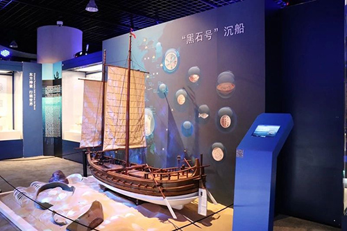 除了通过空间设计营造展览氛围,本次展览更利用丰富的展示手段,为观众更好地展现“海上丝绸之路”的历史与繁荣。本次展览特别注重围绕11艘沉船的经历进行展示设计,通过打破时间、空间的隔阂,将沉船背后的故事讲给观众。漫步展厅,可以发现,每一艘沉船及其所装载的出水文物都会集中展示,并且配合展板上的发掘照片,向观众展现其刚出水的样貌,现场更是展示了黑石号、华光礁一号与南海一号的三只沉船模型,利用灯光、声效、器物为观众还原了这些著名沉船的水下场景,让观众对沉船的理解不只停留在出水的器物,更对整体有了更为深入的认识与体验。