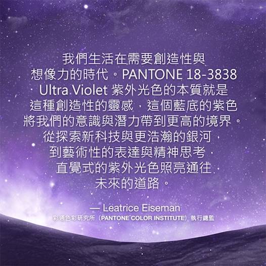 美国新泽西州,卡尔士达特市(2017年12月7日)- 爱色丽有限公司(X-Rite, Incorporated)旗下子公司- 专业色彩标准与数码解决方案供应商彩通公司(Pantone)宣布, PANTONE 18-3838 Ultra Violet(紫外光色) 被选为彩通? 2018 年度代表色。