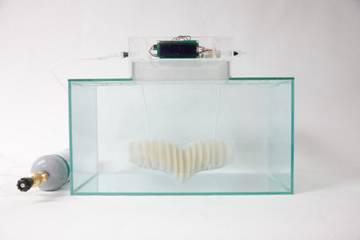 Amphibio 由多孔疏水材料制成。「在海水中,由于波浪起伏不断地混合,溶解了大量的氧分子。一旦「鳃」中的氧气被消耗,就能直接从海水中进行补充。因为它是多孔的,所以水中的氧分子可以透过它的膜,」 Kamei 说。「同样地,系统中积累的二氧化碳可以通过相同的机制,排出到周围的水中。」