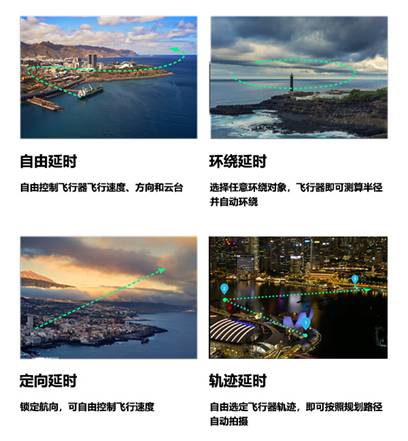「御」 Mavic 2 系列支持以 4 种飞行模式一键拍摄延时摄影——自由模式、环绕延时、定向延时以及轨迹延时,用户可根据自己的镜头规划自由选择不同的拍摄模式。
