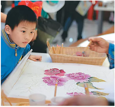 小朋友在马来西亚馆内观看手绘蜡染巴迪