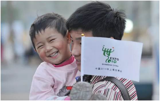一位家长抱着孩子在世博园游览