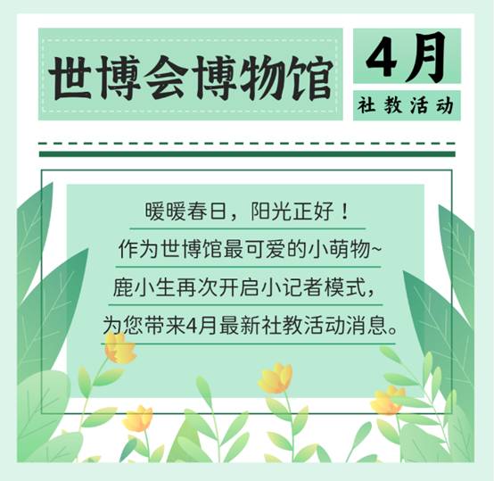 暖暖春日,阳光正好!作为世博馆最可爱的小萌物,鹿小生再次开启小记者模式,为您带来4月最新社教活动消息。