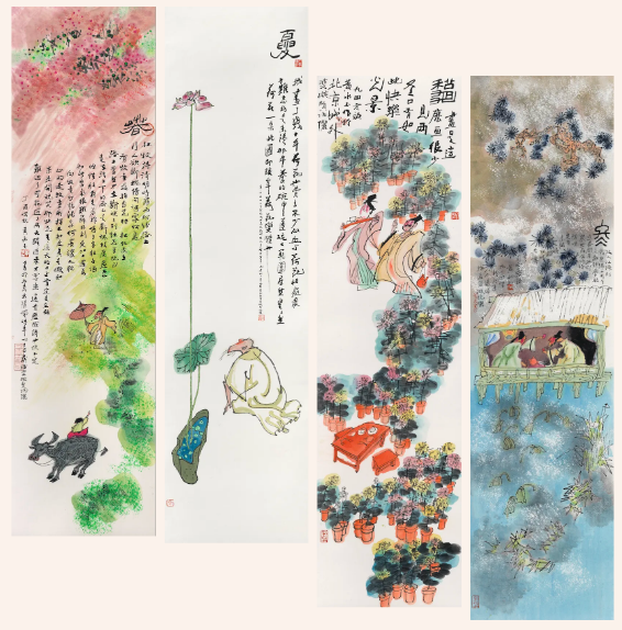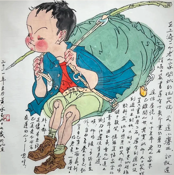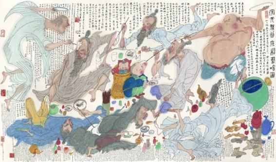 他的画布上,不仅描绘着他幽默诙谐、天马行空的所见所闻与所思所想,更深藏着他对于人生百味的独到理解。他以新颖的视角去重新解读市井生活、神话故事以及人间百态,其中的真知灼见令人耳目一新,作品中既有天真烂漫的赤子之心,更是不乏世事锤炼之后的畅快豁达。