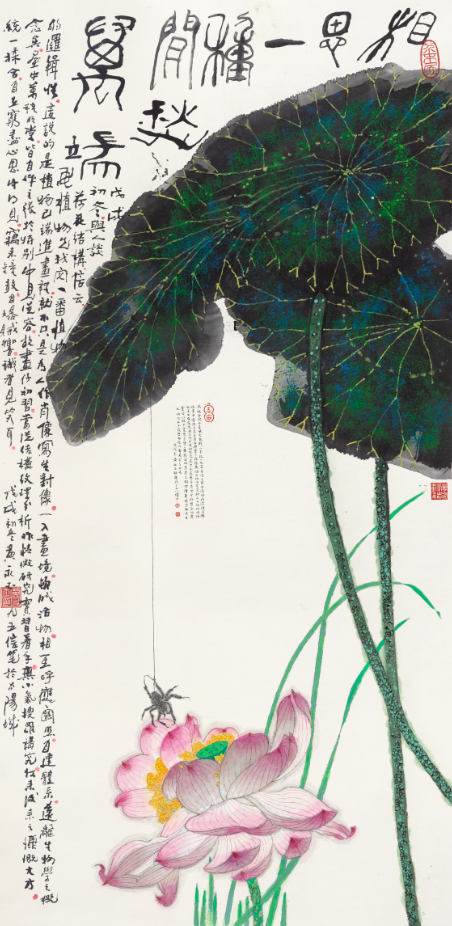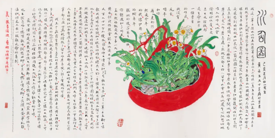 而水仙,则是他笔下的另一种诗意表达。他以简练线条勾勒出空灵之美,借助留白延续东方文人的典雅风骨。水仙的清逸,与荷花的厚重形成鲜明对比,共同构建了他作品中的“入世”与“超脱”双重维度,折射出艺术与生命的共鸣。