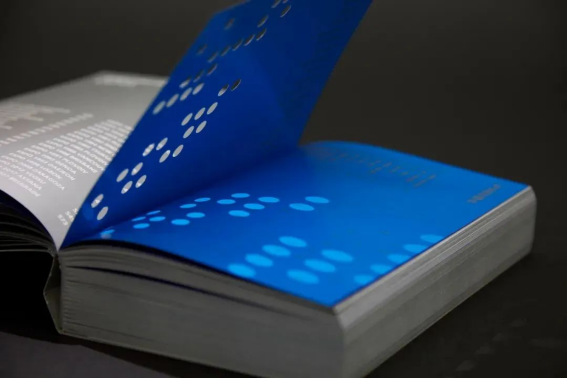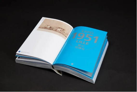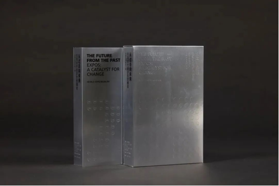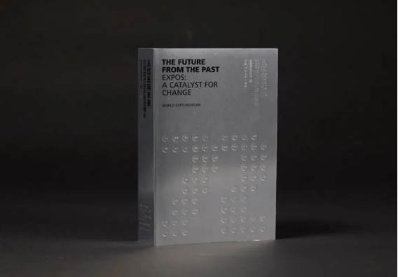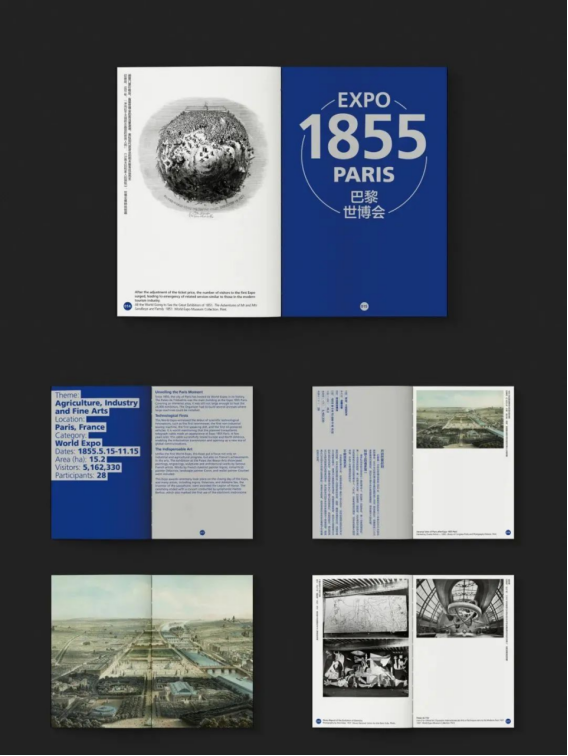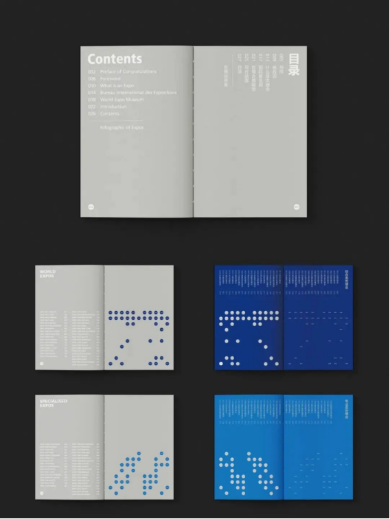 封面用银卡纸打造金属质感,72个圆点代表每届世博会。通过压凹工艺表现历史的印迹,寓意历史与未来的连接。每届世博会首页从小圆点扩展为象征地球的大圆,体现对全人类文明的推动作用。文字采用英文横排、中文竖排的方式表现东西方文化的交融。蓝色和银色始终贯穿全书,三边刷亮银呈现了视觉上的光泽饱满,就像是存放未来的金属容器,承载与记录着人类文明的辉煌。