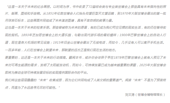 世博会博物馆历时三年编纂此书,以“未来”为切口,以1851年首届伦敦世博会为起点,记载了170余年的世博记忆,系统梳理72届综合类及专业类世博会发展史。全书展示了400余幅记载人类文明发展图标的珍稀档案、历史图像,其中包含设计手稿、图纸、效果图、影像资料、年表等等。本书不仅是2025大阪世博会上中国方所递呈的一份贺礼,更是一本为构建人类文明提供历史坐标系与未来行动的指南读物。