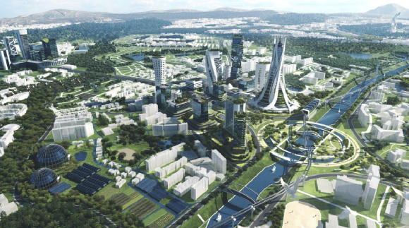 这里建筑与田园景观共生共荣,绿意与自然远比无机建筑更引人注目。充满自然气息的景致四处延展。建筑采用天然木材构筑的未来派曲木结构,道路与轨道同时存在于地面与地下人工基盘中,形成融入城市风貌的立体交通网络。"