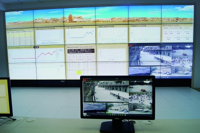 敦煌博物院的监控系统可以实时采集各洞窟中的温度、湿度、二氧化碳浓度,以及观众流量等数据,一旦某洞窟的监控数值接近临界点,便亮红灯报警。监控中心则立即通知现场工作人员关闭洞窟,直到数值恢复到安全值。图为监控中心。(李韵摄)