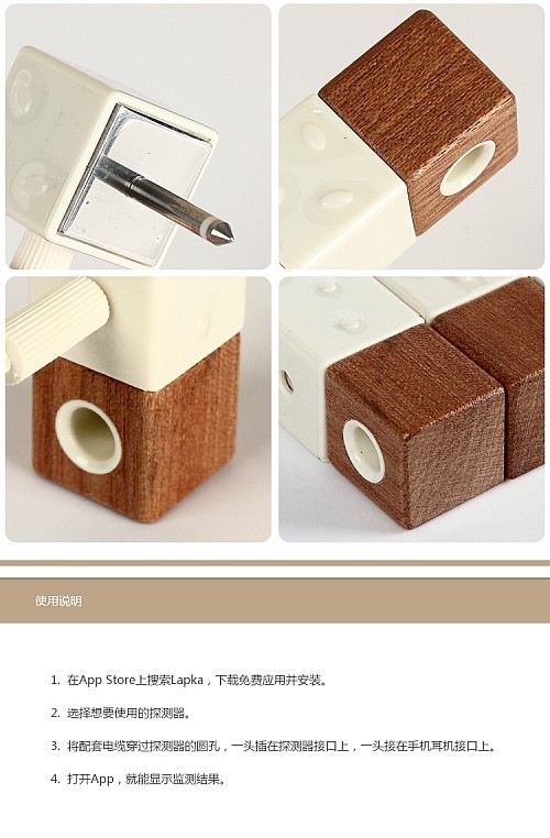 Lapka就是一套iPhone工具,包括一套可以接在iPhone上的硬件和一款对应的免费应用。 Lapka 的硬件包括四个独立的组件,分别是温度/相对湿度检测组件、电磁频率检测组件、食物有机性检测组件以及放射性检测组件这个传感器组件可以用来检测有机食品的真假或者放射性强度、温度和电磁辐射等等环境参数。由于Lapka是使用iPhone作为它的主体和电源,所以它的设计者能够大幅缩小其传感器的大小。