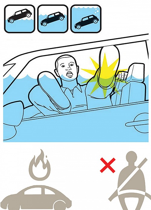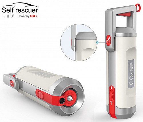 这个自救器有三个功能:切割安全带,用气动锤打破窗户,用二氧化碳灭火。平时可以把它放在车内前方的储存箱内,从物理知识我们知道,二氧化碳气体被压缩到瓶中,如果将二氧化碳液体喷出压缩罐,二氧化碳气体在瞬间将扩展到高速气流,它的压力让空气锤瞬间可以把玻璃敲碎,就可以顺利的在车内水位低的情况下打碎玻璃逃生了。