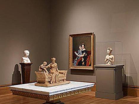 “绘画、雕塑和装饰艺术”按年代以及创作者国籍分类陈列为四个展厅,其中“北区展厅”主要展示可上溯至公元1600 年的绘画和中世纪以及文艺复兴时期的雕塑和装饰艺术。“东区展厅” 主要展示17 世纪的巴洛克艺术,其中包括荷兰、法国、佛兰德、西班牙的绘画及雕塑,此外还包括公元1600 至1800 年的意大利装饰艺术。“南区展厅” 主要展示18 世纪的绘画以及博物馆欧洲装饰艺术的大部分藏品,同时展示可追溯至公元1800 年的布置精巧的镶木房间。“西区展厅”主要展示18 世纪至20 世纪的雕塑和意大利装饰艺术以及19 世纪的绘画作品。新古典主义、浪漫主义以及象征主义风格的雕塑和装饰艺术也在其展示之列。