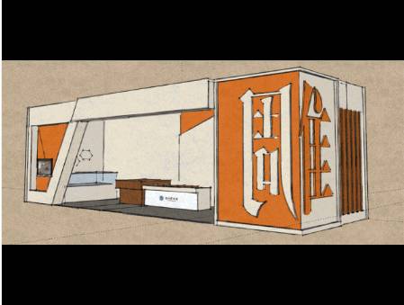 宁波博物馆展区将本馆建筑的主要元素都搬到了展厅。砖瓦结构、瓦爿墙的外墙、清水混凝土墙面等宁波博物馆建筑最有特色的元素都融入到了此次展位设计。