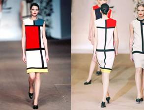 在时尚方面, Yves Saint Laurent 在 1965 年的秋冬系列里,直接把蒙德里安的风格派作品套用在轮廓简洁的连衣裙上。