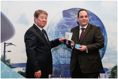 On the occasion of the General Assembly, Mr. Yessimov presented Vicente G. Loscertales, Secretary General of the BIE, with the Order of Friendship of Kazakhstan on behalf of the President of the Republic of Kazakhstan, Nursultan Nazarbayev. The award – a Dostyk Order of the 2nd degree – was accepted on Mr. Loscertales’ behalf by Dimitri Kerkentzes, Deputy Secretary General.