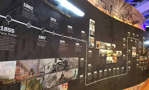 Following the time axis, the display boards exhibit the time, place, duration and theme of each Expo since 1851, accompanied with iconic architectures or photos of pavilions.