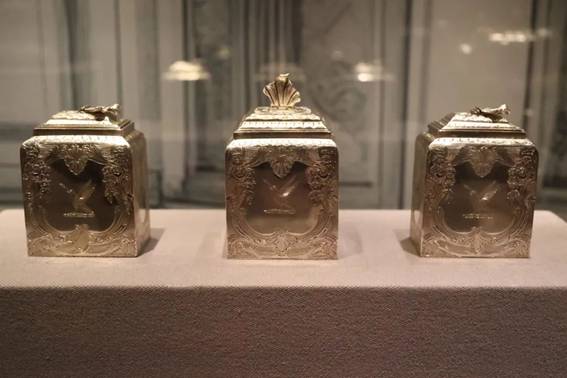 在“璀璨万象——英国V&A博物馆珍藏吉尔伯特精品展”中,有着两件类似的文物——茶壶和一套三件的茶叶罐。