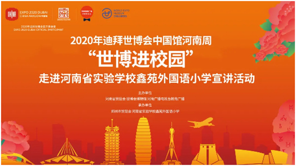 2020迪拜世博会,中国馆围绕“构建人类命运共同体——创新和机遇”这一主题,充分展示中国在信息、科技、教育、交通等领域的创新成果,与世界各国增进交流与合作。河南周活动以“创新发展合作共赢”为主题,于2021年12月27日-29日在迪拜世博园区中国馆和郑州采取线上、线下加直播的方式同步进行。
