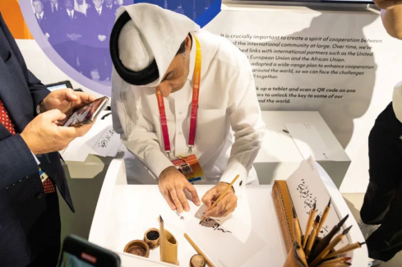 卡塔尔书法家现场为参观者书写阿拉伯语