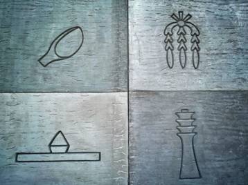 The spliced wall of wooden boards displays a collection of words—their roots come from different languages, but they all originate from the Ugarit alphabet.