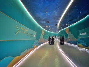 Inside In the Egypt pavilion, the mystery of ancient Egyptian culture is revealed with flowing hieroglyphs. With the help of the dynamic effects of digital images, thousands of characters seem to flow down the galaxy and gather on the ground, immersing in the experience of the baptism from ancient text.