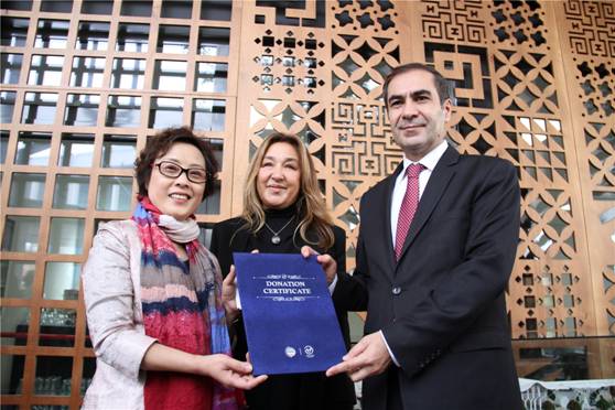 Jiang Sha (first on the left), Curator of World Expo Museum Pavilion awarded the donation certificate to Tar?k Sönmez (first on the right), General Representative of Turkey Pavilion.