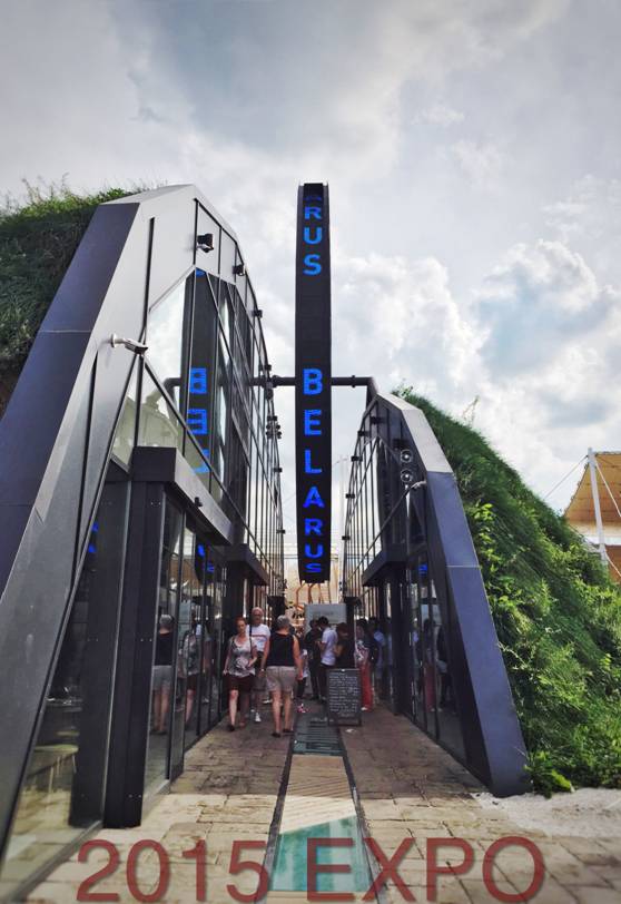 In Expo Milano 2015, the Republic of Belarus was engaged in displaying its agricultural industry and power. This pavilion named by "The Wheel of Life" displayed the most important natural resources of Belarus: food, salt and water resources. It was designed to be a hill fully covered by green grass; from the middle of the hill, it was cut through in half, by which the main passageway was formed. The passageway went through the whole structure, just like a stream running through the landscape. At the same time, a large water-wheel was set up within, becoming a dynamic symbol for the whole structure. The exhibition hall under the cambered hill displayed the agricultural issues and the future strategies of Belarus.
