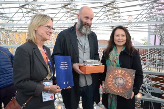 Liu Xiuhua, General Representative of World Expo Museum Pavilion, awarded the donation certificate to Sara Everett (first on the left), Curator of UK Pavilion; the man in the photo is Wolfgang Buttres, Architect of UK Pavilion.