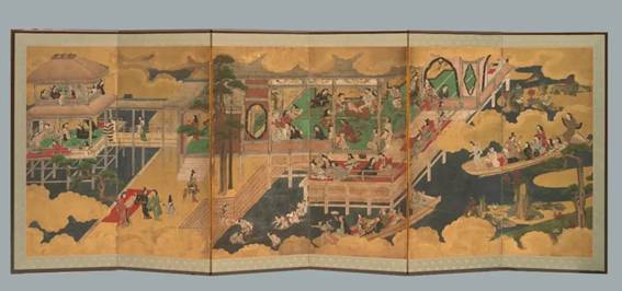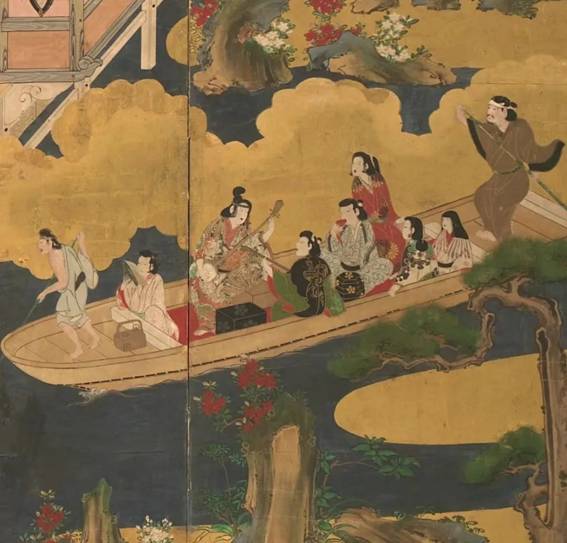 This single screen depicts scenes of recreational activities such as drinking, singing and boating in a fictional setting. The people in the picture have a happy expression. Such colorful paintings of secular scenes by unofficial, non-academic painters were popular at the beginning of the Edo period (1603-1868) among those who wanted to share a sense of pure pleasure without political or religious intent. This attitude and style of painting later developed into Ukiyo-e woodblock prints, which literally means the ups and downs of the world, representing the popular culture of the Edo period.