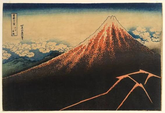 Katsushika Hokusai is one of the most famous Japanese artists, and the series of Thirty-Six Views of Mountain Fuji is his most famous work. This print depicts Mount Fuji in a more serious way as a thunderstorm approaches. It is called "black Fuji", because the mountain tone is sharp and deep. Another painting in the same series with a similar composition is called "Akifushi" because of its more serene brushwork depicting Mount Fuji under a clear sky.