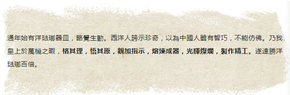 ¡¡¡¡" Foreigners thought that the Chinese could not imitate it." meaning that Westerners thought we Chinese although smart, but can not do enamel painting. As a result, under the Emperor's wise guidance, not only make it, but also "far better than foreign enamel a hundred times".