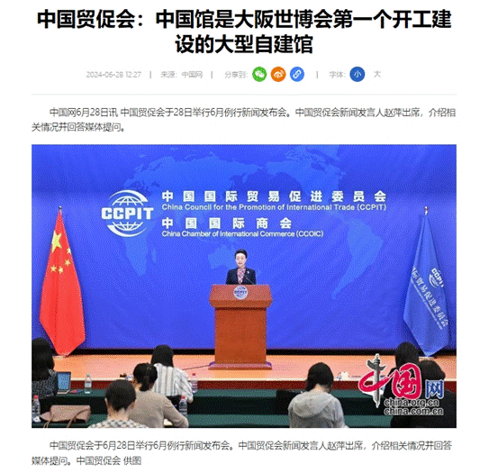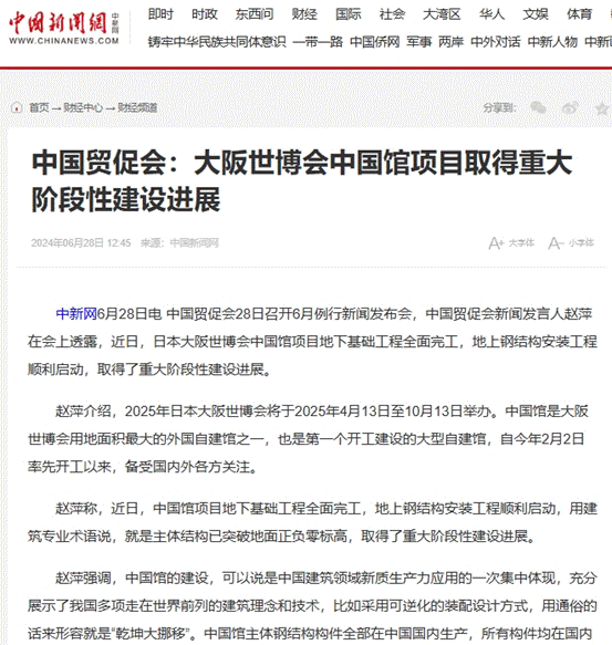 CHINANEWS, IQILU and other media reported that the China Pavilion project at the Osaka World Expo has made significant progress in construction. Spokesperson Zhao Ping said,“In the next step, CCPIT will work with the design and construction team of the China Pavilion project, adhere to high level, high quality and high standard, and push forward the construction process of the China Pavilion project in an orderly, powerful and effective way, so as to build ‘China Speed’, show ‘China Quality’, establish ‘China Brand’ and contribute to the Osaka World Expo by building ‘China Speed’,‘China Quality’ and ‘China Brand’. We will work with the design and construction team of the China Pavilion to push forward the construction process of the China Pavilion in an orderly, powerful and effective manner, so as to build the China Pavilion with “China's speed”, show “China's quality” and establish “China's brand”, and leave the “China's imprint” for the Osaka World Expo.