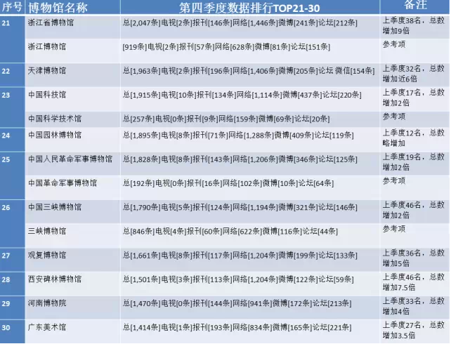 从博物馆社会影响力的总体看,2014年第4季度的社会影响力(关注度)比第3季度提高了近6倍。各博物馆的排名顺序也有较大的调整。