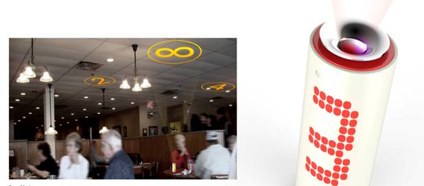 这其实是个新型的投影仪叫做Serv-mark。现在已经有些餐厅为了追求更好的服务质量而使用点餐器了。而目前使用的点餐器工作原理大部分都是利用遥控震动,即在点完餐后回到座位等待,当餐点做好时,餐厅会遥控震动通知顾客前往柜台取餐。这是一种是半自助的方式,依旧需要客户的操作。