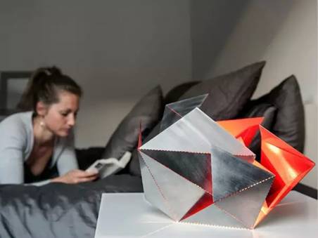 ORIGAMI LAMP折纸灯,并非是以纸为原料,而是造型按照了折纸设计,并且这张折纸可不是有规律的折叠,更像是被团出的废纸。这款灯的材料是使用0.6 mm的不锈钢作为灯罩,没有灯座、灯柱,内部的灯光通过折射释放光亮,有多种颜色可供选择。作为房间的装饰,这是一个不错的设计。
