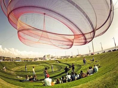 美国女艺术家 Janet Echelman 使用彩色网状结构在空中搭建了一系列炫酷的悬浮作品,并且这些作品可以随风而动,如梦如幻。