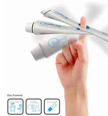 这一设计由韩国檀国大学的几位设计师共同带来,设计师们直接从牙膏包装上着手,在牙膏管末端设置一个旋转圆孔,当你将它挂在手指上旋转时,离心力就会起到挤压作用、推动牙膏往牙膏管口方向移动,让用户在达到“挤牙膏”目的同时,也享受到乐趣。