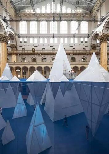 美国华盛顿的国家建筑博物馆(National Building Museum)有一个七层楼高的中庭,今年夏天,这里出现了一个20英尺(6米)高的蓝色盒子,一些白色的三角锥遍布在盒子上下,或者从顶上冒出来,就像是海洋上漂浮的冰川。也有一些出现在盒子里面或倒挂在“水平面”之下,透过半透明的蓝色的外壳隐约看到,仿佛是一个神奇的海洋世界。