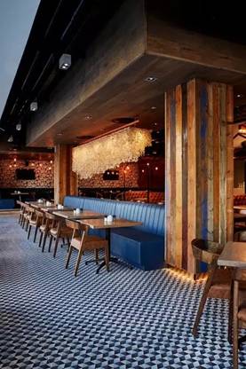 为室内营造在浪花下的气氛,设计团队将地面、墙面和天花同时使用由深蓝渐变到白色的小片瓷砖。瓷砖都是当地工匠手工精心制作,它同酒吧外白色混凝土格栅围合出一个浪花泡沫般的蓝色空间。