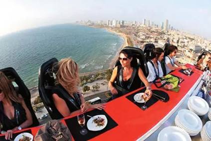 比利时人在饮食文化上注重改革和创新,在觥筹交错之间找到了创新点,设计出天马行空的空中餐厅,很快便风靡全球。比利时的空中餐厅,开设在首都布鲁塞尔,人们可以在50米的高空中就餐。空中餐厅重6吨,四周固定着配有安全带的座位。整个餐桌固定在金属框架上,由一台120吨巨型起重机吊在高空。餐厅所有的座位都可以斜靠甚至旋转180度,胆大的美食家们可以自选座位和角度,在天空中尽情享受美景与美食。