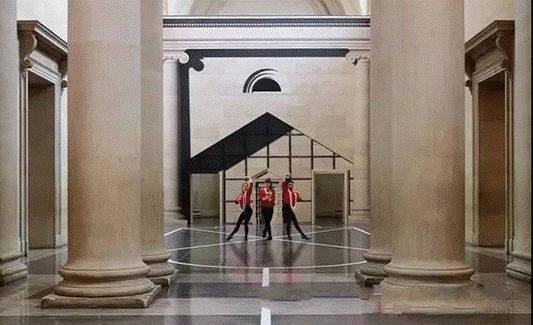 他们穿着黑色的紧身裤和宽大的红色上装,颈上装饰着硕大的仿珍珠项链。他们翻转手腕,颤动手掌,推展腰臀翩翩起舞,然后在指定的姿势静止。表演灵感源于17世纪意大利的「Sprezzatura」 礼仪风尚——大致可以理解为「不经意的优雅」,同时令人想起20世纪后期纽约同志舞会上兴起的Voguing舞风。静止的姿态教人回忆起1937年开馆之时;当年这座圆拱形新古典风格巨厅是为雕塑展览而建。大型「错视派」雕刻装饰艺术以画廊外部建筑为题,将展厅幻化为层次鲜明的动感空间。阿根廷艺术家Pablo Bronstein设计的《Historical Dances in an Antique Setting 》,是今年的泰特艺术计划(Tate Commission )的特别展览项目,展出至10月9日,它颠覆了时空、建筑和各类艺术元素,必定令观者耳目一新。