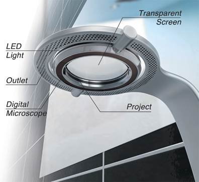 iWash和一般的感应水龙头出水原理是一样的,圆盘的最外层是一圈密集的出水孔,手靠近时会自动出水。最大的区别在于顶部的数字显微镜和圆形显示屏,最内层则是一圈数字显微镜和圆形显示屏,可以显示红、绿两色,它能够将你手上的细菌放大。在这里,你手上所有的细菌都会被识别出来。如果细菌很多,系统会呈现红色LED灯,如果洗手后细菌减少到正常水平,LED灯会变为绿色,显示屏也会变成透明,告知你洗手完毕,否则会提示重新清洗,不过如果你没有认真洗手的话,细菌还是会扭来扭去显示在你的面前,非常直观。
