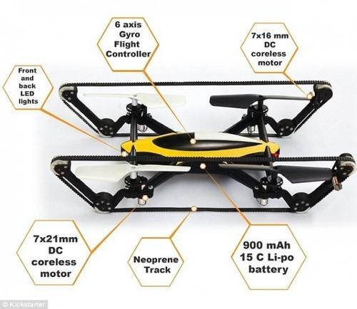 来自英国一位工程师Witek Mielniczek曾经设计过一款带飞行功能的遥控汽车,可惜只能在平地上行驶。后来他将设计出了一个升级版,将车轮改成坦克车带,四旋翼遥控无人机与坦克相结合的机「B-Unstoppable」。