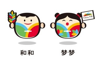 中国国家馆吉祥物,“和和”和“梦梦”。设计源自“天、地、人、和”中的“和”字,并结合惠山泥人的设计原型。 “和”由“禾”和“口”组合而成。“禾”代表水稻,延伸意义为粮食;“口”代表饮食,延伸意义为人口。“禾”与“口”的组合,不仅紧扣世博会主题,也与中国馆主题相吻合。吉祥物身躯源自“和”字中的“口”字,手拿体现“禾”字的稻谷,形象具有积极、友善、乐观的精神。