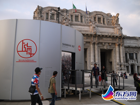 6月10日上午,游客在意大利米兰市中心的中央车站广场参观新版“360度上海”体验型展览